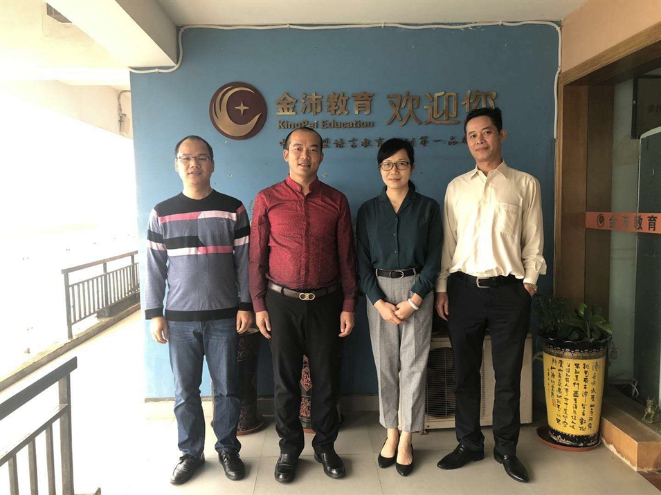 廣西金沛教育執(zhí)行董事粟宥朝(左二)、國際部合伙人許顯鋒(左一)與廣西國際文化交流中心副秘書長羅琨(右二)、經(jīng)濟科技部部長吳偉(右一)一行合影留念