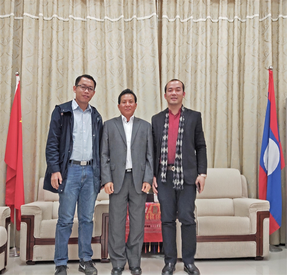老撾駐南寧總領(lǐng)事館副領(lǐng)事坎平(中間)與老撾蘇州大學(xué)校長助理馮溫格(左一)、廣西金沛教育執(zhí)行董事粟宥朝(右一)合影留念