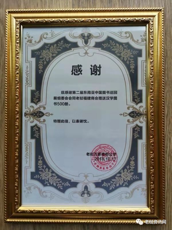 贈書活動儀式安排在學校會議室舉行,寮都公學董事長林俊雄從老撾福建商會代表們手中接過由第二屆東南亞中國圖書巡回展組及老撾福建商會共同向竂都公學捐贈的價值近3萬元的圖書。據(jù)介紹,本次捐贈圖書內(nèi)容涵蓋中國傳統(tǒng)文化、經(jīng)典文學、漢語學習為主等各類圖書500冊。交接儀式結(jié)束完畢后,林俊雄董事長當場向老撾福建商會代表頒發(fā)了受贈感謝狀。