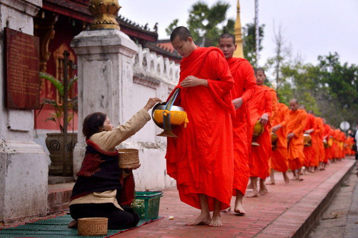 在老撾的許多地方,布施是一道獨特的風景。每天拂曉,僧人們會離開寺院,身披橙色袈裟,結(jié)隊到街道上或村莊里化齋。虔誠的佛教徒跪在道路的一邊,雙掌合十,接受僧侶誦經(jīng)祝福。誦經(jīng)完畢,僧侶們排著隊伍依次從人們的面前赤腳行過,人們把米飯、餅干、水果、雞肉等食物放進僧人們的竹編小籃中。這些食品,就是僧人們一天的口糧。