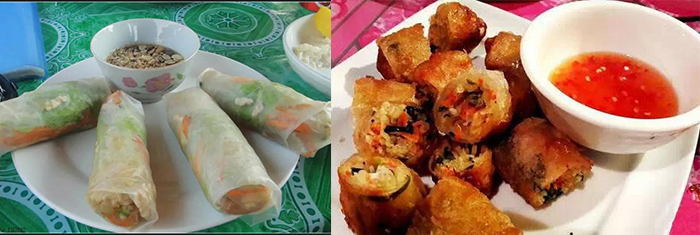 老撾的春卷通常會有蒸和炸兩種不同做法,蒸春卷很清淡,米皮很薄呈半透明,可以選擇蝦、雞肉、豬肉、薄荷葉及蔬菜等不同餡料,配上酸甜醬汁非常爽口,價格也很親民。