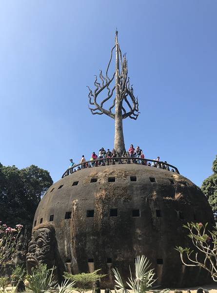 香昆寺里有一座球形的塔,與河對岸廊開(泰國)的萬橋公園遙相呼應(yīng),這便是著名的“天堂地獄塔”。每個來這里的人都要進(jìn)去走一走,體驗從“從地獄到天堂”的過程。