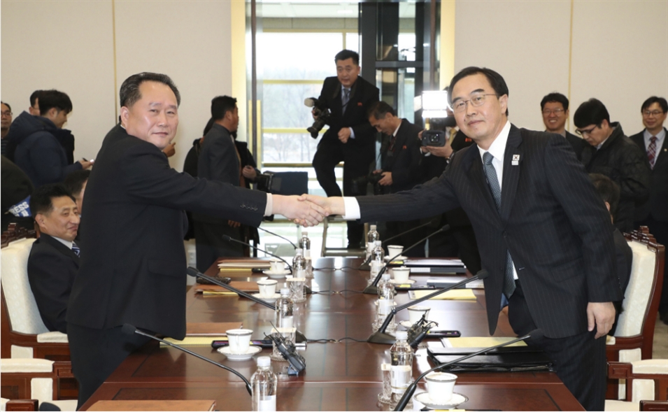 當(dāng)?shù)貢r(shí)間2018年1月9日,韓國(guó)和朝鮮代表在板門店韓方一側(cè)“和平之家”舉行韓朝高級(jí)別會(huì)談,就朝方派代表團(tuán)參加平昌冬奧會(huì)、南北關(guān)系改善等共同關(guān)心的問(wèn)題進(jìn)行討論。這是時(shí)隔兩年多之后,韓朝雙方再次實(shí)現(xiàn)高級(jí)別對(duì)話。