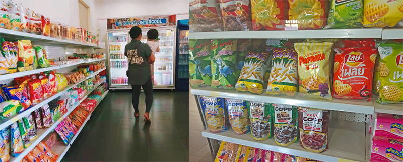 食堂區(qū)的小商店我們在《我在老撾國立大學(xué)的生活—食堂篇》中介紹過,其實可以猜到,既然開在食堂,那售賣的物品當(dāng)然以食物為主,比如紅牛、牛奶、果汁、汽水之類的飲料應(yīng)有盡有,當(dāng)然,薯片、餅干也是必不可少的。