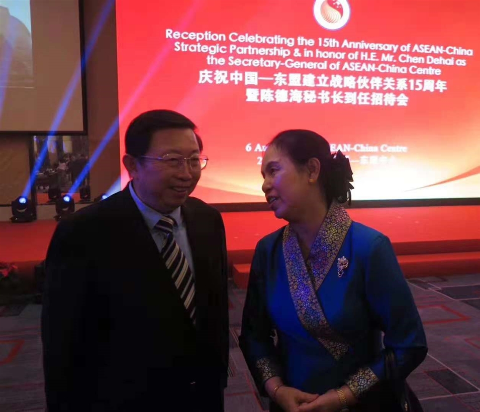 2018年8月,在中國(guó)—東盟建立戰(zhàn)略伙伴關(guān)系15周年招待會(huì)上,許寧寧與老撾駐華大使交談。