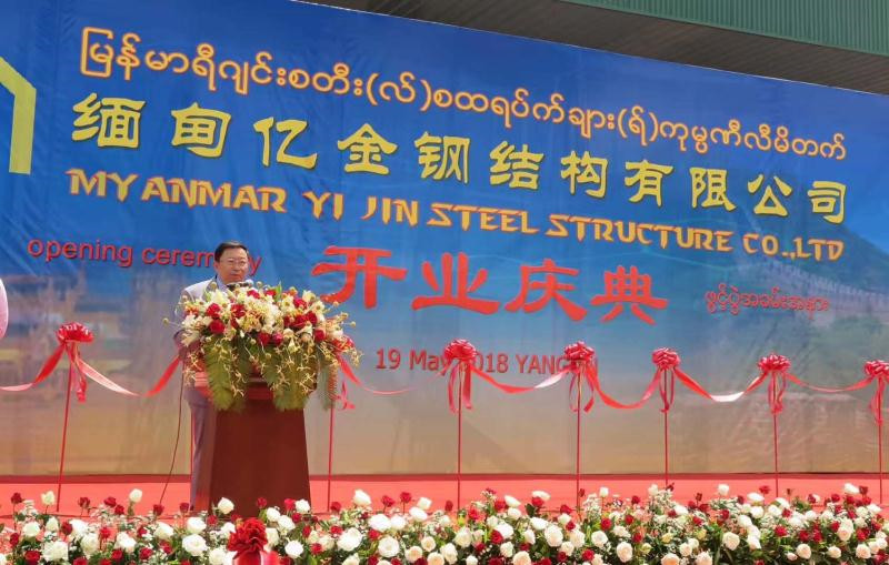 2018年仰光市,中國—東盟商務理事會執(zhí)行理事長許寧寧應邀在緬甸億金鋼結構公司開業(yè)盛典上致辭:中緬企業(yè)增進合作、共同發(fā)展。該公司是中緬合資,是緬甸最大的鋼結構加工和安裝企業(yè),承建了包括緬甸國家體育館、曼德勒商務與會議中心等多個標志性建筑。