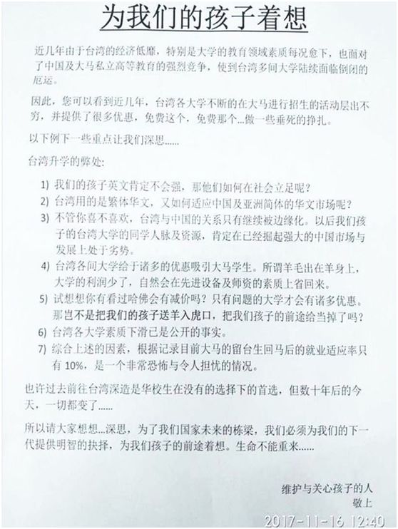 原標(biāo)題:馬來西亞中學(xué)瘋傳這封公開信,臺(tái)灣怎么辦? 馬來西亞中學(xué)瘋傳一封“別讓孩子到臺(tái)灣念大學(xué)”的公開信,在島內(nèi)引發(fā)關(guān)注。